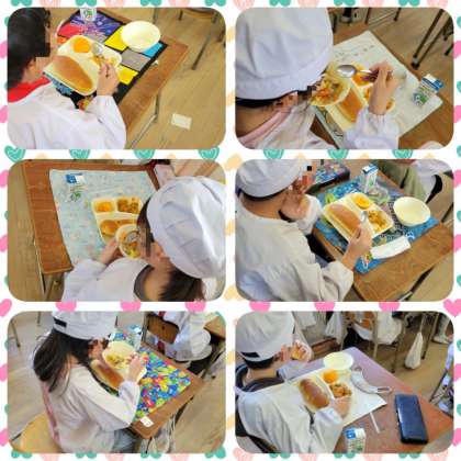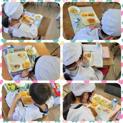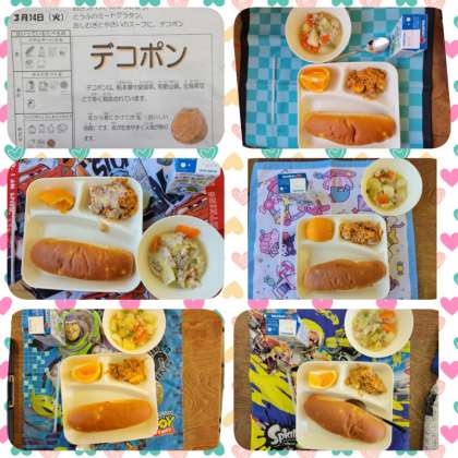 今日の献立は、おさつパン、牛乳、豆腐のミートグラタン、押し麦と野菜のスープ煮、デコポンでした。