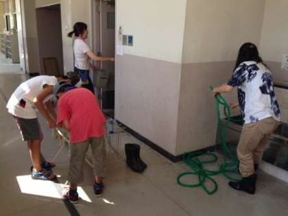 明日から始まる2学期に備え、午前9時30分から約1時間、PTA合同大掃除が実施されました。各トイレ、廊下、階段、体育館、花壇を中心に保護者、子ども、教職員が力を合わせて清掃しました。おかげさまで美しくなりました。暑い中、またご多用の中ご参加いただいたみなさんありがとうございました。