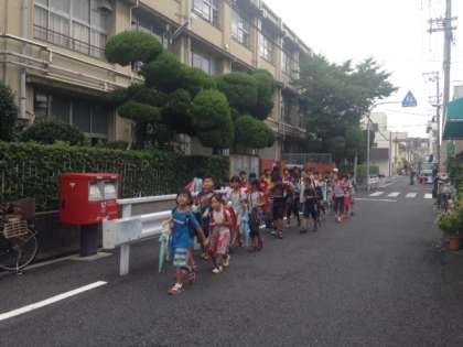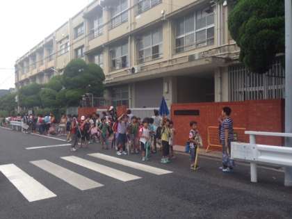 緊急時に、お家が近い子どもたちで安全に集団下校できるようにするために「地域別子ども会」を実施しました。地域代表の子どもたちが講堂に並んだ1年生を迎えに行き、各割当て教室まで優しく誘導していました。また、教室での人数確認等ができたら、廊下に整列し、遠い班から順に下校をしました。