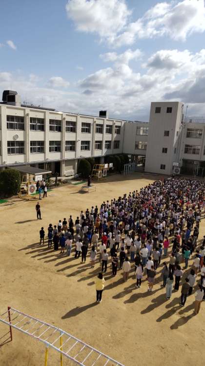 今日は、運動場での児童朝会でした。校長先生から、「安全に気を付けて過ごしましょう。」というお話がありました。