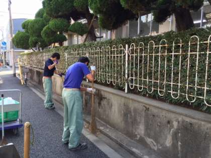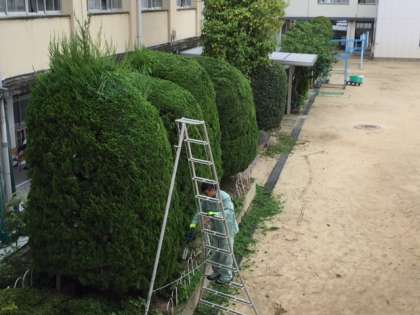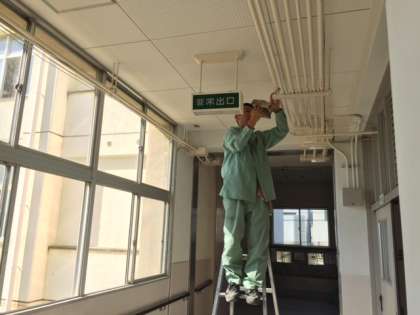 本校には二人の管理作業員が勤務し、樹木の剪定をしたり、学校周りの溝の掃除をしたり、廊下の天井下を走る配線などのカバーに溜まった埃を掃ったりと環境整備に努めています。