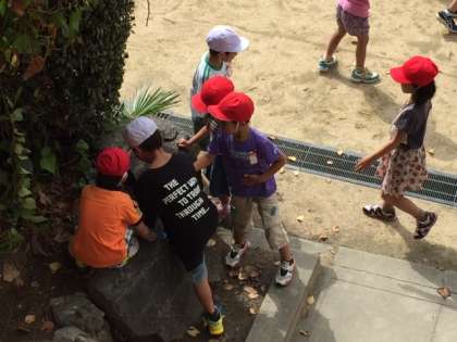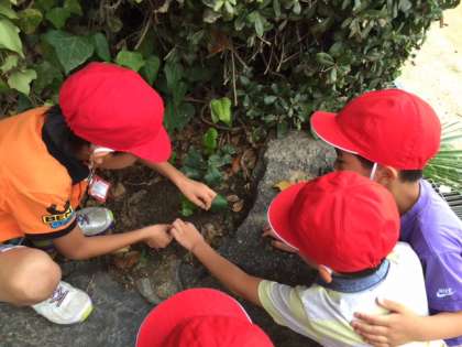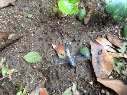 2時限目が終わった休憩時間、校長室にいると、近くの階段辺りから子どもたちの「校長先生とこ行かな!」「校長先生いてるかな?」と言う声が聞こえてきました。何の用事かなと楽しみに待っていると1年生の男の子たちが、「校長先生トンボが、死んでないけど元気ないねん。どうしたらいいですか?」とやって来ました。手元を見るとシオカラトンボのオスを大事そうに持っていました。「もう寿命かも知れんから、木の近くにおいてそっとしといたげる方がいいよ。」と言うと、「わかった。」と言って、また階段を下りて行きました。廊下の窓から下を見ていると、子どもたちはヤシの木の下あたりにそっとトンボを置いて頭を寄せ合って眺めています。「さわったったらあかんで!」「そっとしとかな」などと話しているのが聞こえてきます。私も下に降りて仲間に加わりました。一人の子が「あっ、仲間が探しに来てる!」というので空を見上げるともう一匹トンボが飛んでいました。