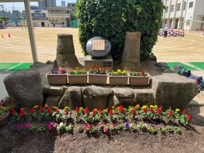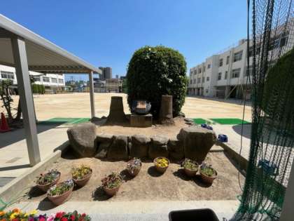 環境委員会と管理作業員さんが協力して、玄関に花壇を整備しました。