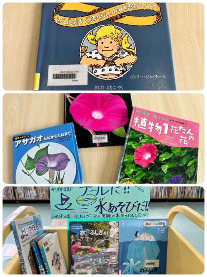 水泳の本、水あそびの本のコーナーも見てくださいね。