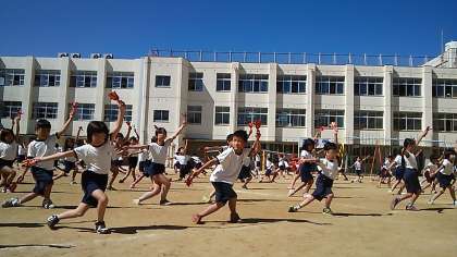 どの学年も最後の仕上げとして、演技に気持ちをこめて練習しています。写真は4年生の団体演技「STARS〜大きな花を咲かせよう〜」です。快い鳴子(なるこ)の音と、ダンスのキレとの軽快なコラボレーションが素晴らしいです。