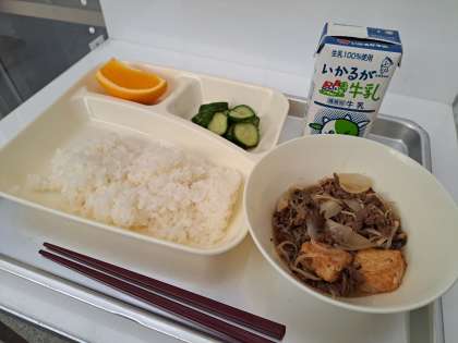 牛肉、あつあげ、たまねぎ、えのきたけ、糸こんにゃくを甘辛く味つけしています。「ふ」は使用していませんので、小麦アレルギーをもつ児童も食べることができました。