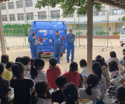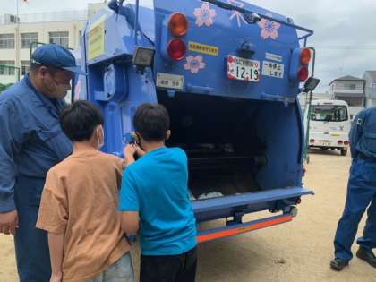 6月13日、環境局の出前授業がありました。パッカー車にごみの投げ込み体験をしたり、ごみの分別などについてのお話しを聞いたりしました。クイズなどを交えたお話しで、楽しく学習することができました。