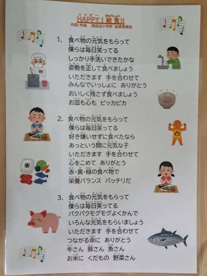 今週は、南田辺小学校給食委員会オリジナルの、「HAPPYきゅうしょく」という歌を給食中にかけています。覚えやすい歌詞と曲なので、子どもたちもお昼休みに口ずさんでくれています。