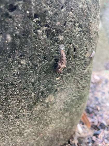 スミレを食草とするツマグロヒョウモンチョウがパンジーを食べて成長し、蛹になりました。