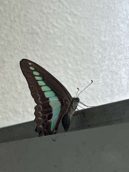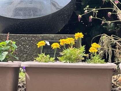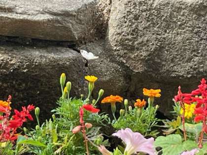 玄関前の花壇ほ、チョウの食草園になっています。花の蜜を求めて、モンシロチョウやツマグロヒョウモンチョウ、キアゲハ、アオスジアゲハなどいろいろなチョウが集まって来ています。