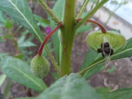 1年生の教室前の花壇に、オシロイバナの種とホウセンカの種ができ始めています。どちらも大変興味深い種です。なぜオシロイバナと呼ばれているのか、その理由が種に隠されています。また、ホウセンカの熟した実にはとてもおもしろい特徴があります。保護者の皆さんはもうご存知と思いますが、子どもたちが知ったらきっと「へえ—」「おもしろい」と喜んでくれると思います。おうちでもお子さんに教えてあげたり、一緒に調べたりしてみてください。