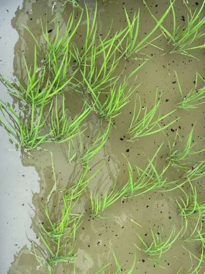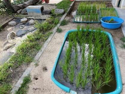 ビオトープの田んぼを拡張しました。新たに二畳ほどの広さが増え、環境委員会の児童で田植えをしました。