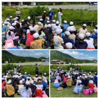 宿舎前の広場で開舎式を行いました。代表の児童の後宿舎の方のお話を聞きました。