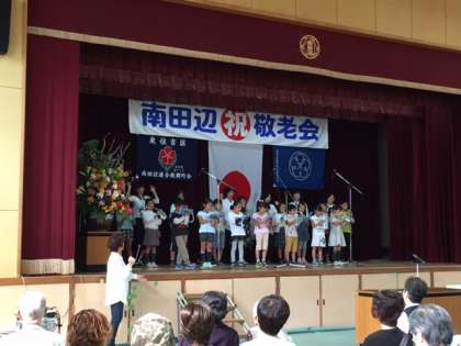 昨日4日(日)に本校講堂にて、南田辺地域活動協議会主催の『第65回南田辺敬老会』が開催されました。4・5年生が書いたお手紙を6年生の代表の子どもたちが受付でお渡ししました。また、第二部では、生涯学習ルームの「鍵盤ハーモニカ」のグループの方々と2・3年生の希望者でのコラボレーションとしての演奏、6年生代表の子どもによる踊りが披露されました。今日は朝からおじいちゃん、おばあちゃんからお礼の手紙が学校に届いています。子どもたちに手渡すと「やったぁ!」とうれしそうに読んでいました。地域で育つ“南田辺小の子ども”。また、一つ絆が強まりました。