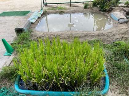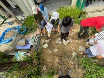 8月31日の委員会活動で、ビオトープの池をみんなで作りました。