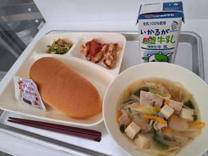 韓国・朝鮮の料理です。給食室で揚げた鶏の唐揚げに、料理酒、みりん、こいくちしょうゆ、ケチャップ、コチジャンで作ったタレをからませています。子どもたちに大人気の献立のひとつです。