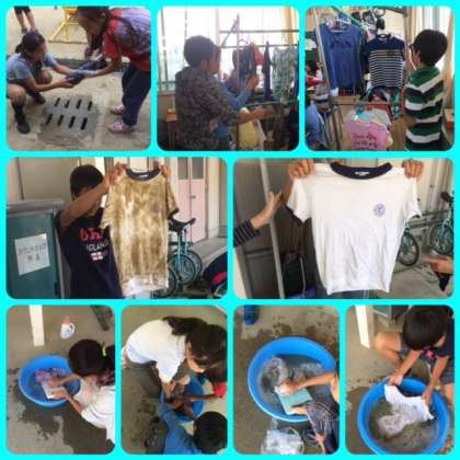 水と洗剤を入れた大きなたらいの中でもみあらいや洗濯板でのこすり洗いなどをしました!!!汚れが落ちた洗濯物を流水ですすぎ、干しました☆☆☆