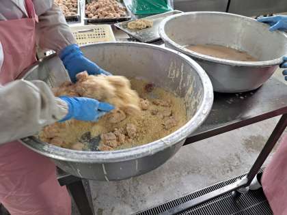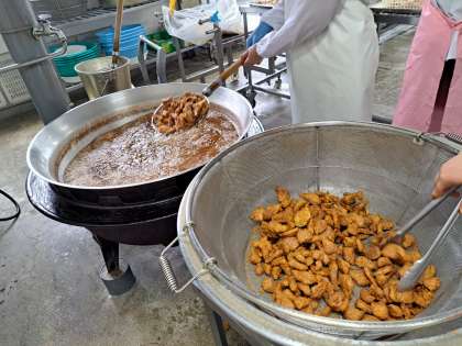 ひとつひとつ下味と衣をつけて揚げた角切りの豚肉に、八丁みそと赤みそ、砂糖、みりんを合わせてとろみをつけたタレを絡ませています。