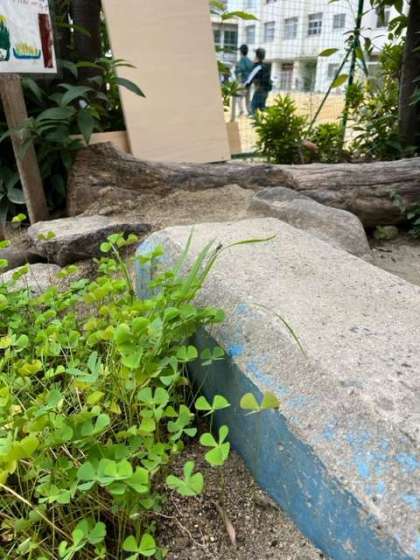 雑草(カタバミ、エノコログサ、オオバコ、ヒメジョオン、メヒシバ)も集めて育てています。踏まないように観察しましょう。