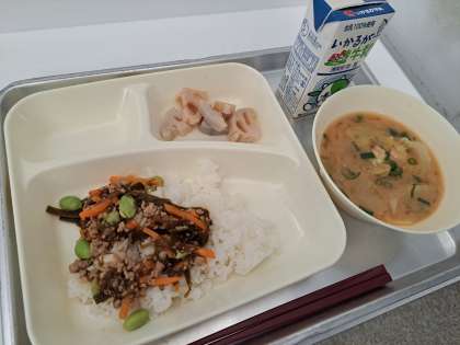 もずくと豚ひき肉、にんじん、むき枝豆、切りこんぶ、豚骨スープの旨みが広がる混ぜご飯です。ジューシーとは沖縄の郷土料理で、炊き込み御飯や雑炊のことをいいます。