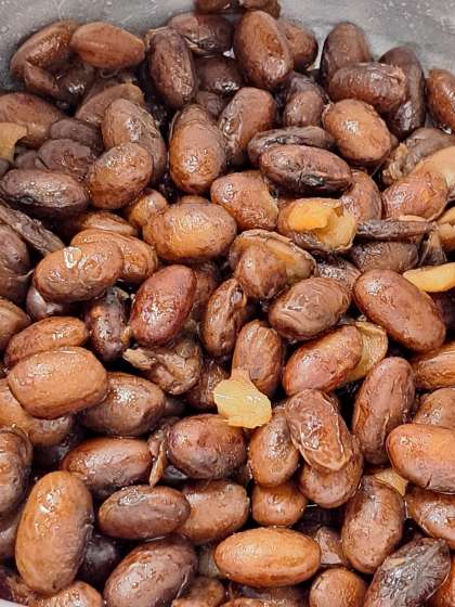 表面がうずら卵の模様に似ていることから、うずら豆という名前がついています。今日はバターの代わりにオリーブ油、砂糖、塩でグラッセにしていただきました。
