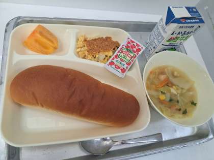 液卵、ツナ、じゃがいも、塩、こしょうを合わせ、バターをかけて焼いています。バターの風味が食欲をそそる一品です。1人1袋あてのケチャップをかけていただきました。
