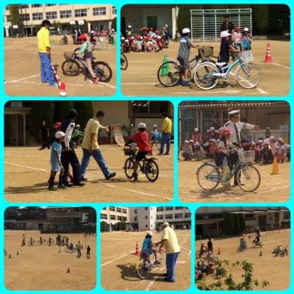 警察官の方から自転車に乗る時の注意、点検する箇所などのお話を聞き、運動場に作った道路を使い、実際に自転車に乗り練習しました。