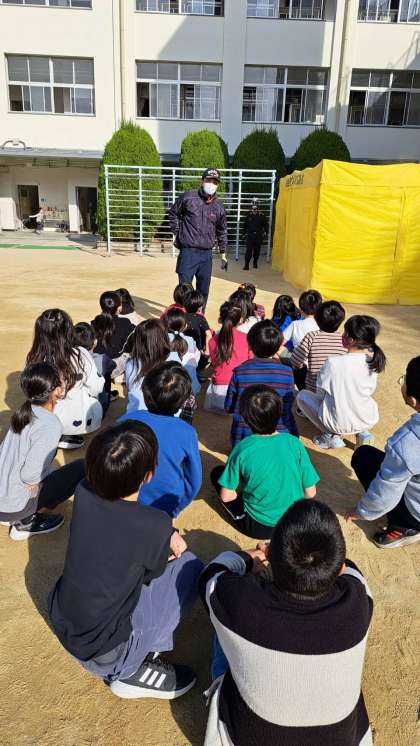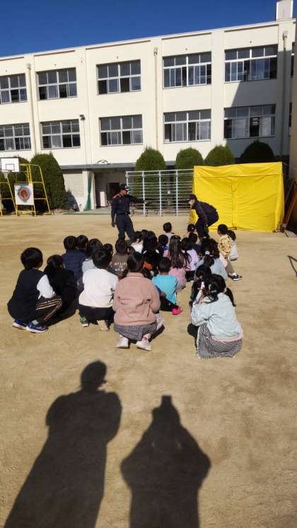消防署の方のご協力もあり、火災が発生した時に想定される「たくさんの煙の中」を避難する体験学習を行いました。きれいな空気は下にたまるので、姿勢を低くして避難することが大事だということを教わりました。とても視界が悪い中避難するのはとても大変だということが体験できました。