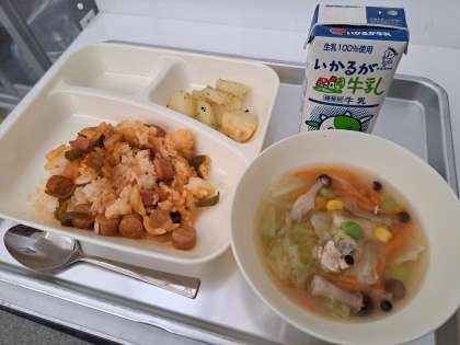 ご飯にケチャップで炊いた具をのせ、お皿の上で混ぜ合わせていただきます。「オムライスの中身や〜」と子どもたちに人気のあった献立です。隠し味にカレー粉が使われていて、深みのある味わいとなっています。