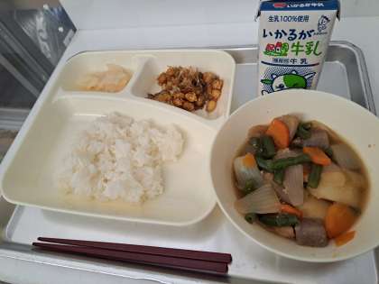 熱湯でもどした乾燥大豆に片栗粉をまぶして油で揚げ、ゆでたちりめんじゃこと煎ったゴマを合わせ、砂糖としょうゆを煮詰めた甘辛い調味液をからませています。かみごたえのある、大人にも子どもにも人気の献立です。