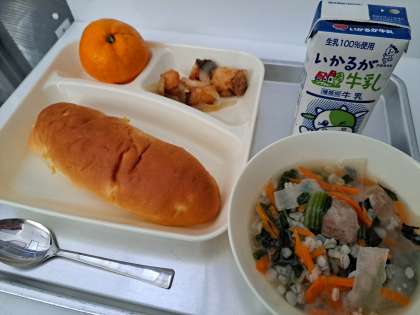 肉だんごと食物繊維の多い押し麦のスープです。旬のだいこん、にんじん、ほうれん草もたっぷり入っています。
