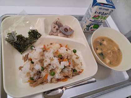 しょうが汁で下味をつけた鶏ひき肉、つきこんにゃく、ごぼう、にんじん、グリンピースを使用した混ぜご飯です。個々のお皿の上でご飯と具を混ぜ、きざみのりをかけていただきます。