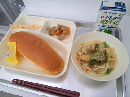 大阪で生まれたといわれているきつねうどんをイメージして作られています。三角形に切って甘辛く煮たうすあげと、かまぼこ、はくさい、青ねぎが入ったうどんにとろろこんぶを入れて食べます。とろろこんぶは昔から大阪で作られていることから、大阪市の給食では「なにわうどん」と呼んでいます。