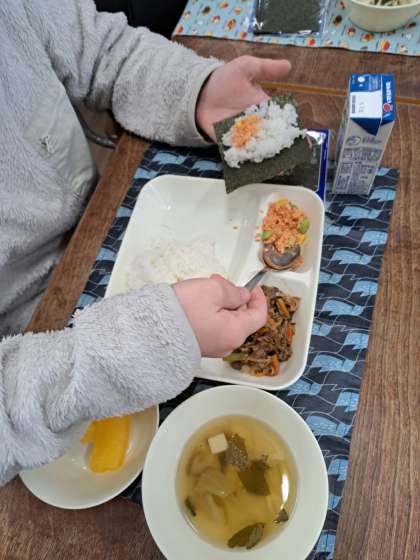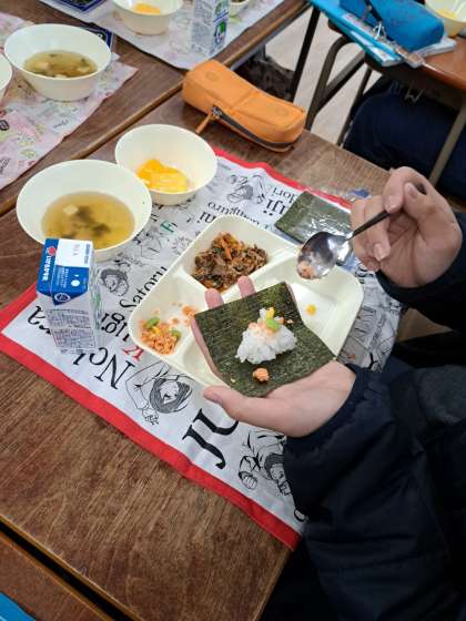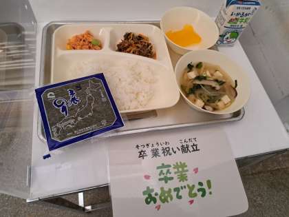 今日の献立は、6年生の卒業をお祝いする、いつもより1品多い「卒業祝い献立」でした。ボリュームがあって彩りもきれいな献立に、テンションがあがっていた子どもたちでした。