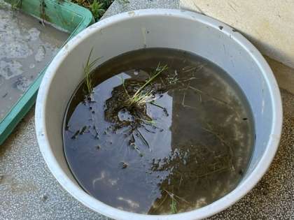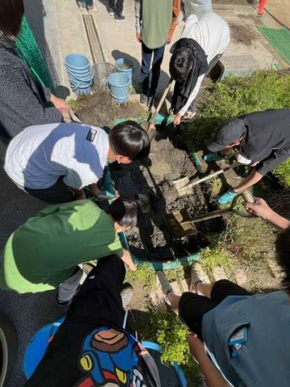 風の涼しい五月晴れ中、6月の田植えに向けて、田起こしをしました。逃げ出してきたヤゴをビオトープに逃したり、植物と一緒にタライにうつしたり、普段なかなかできない体験に挑戦していました。