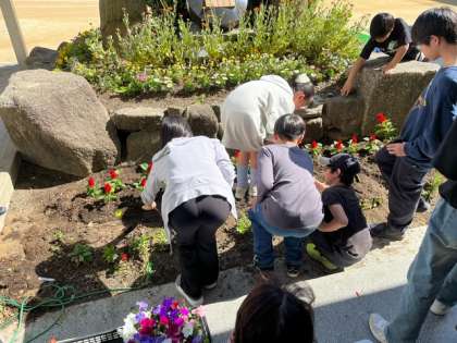 また、玄関の花壇のノースポールとチューリップをサルビアとマリーゴールドに植え替え、綺麗な花で玄関を彩りました。