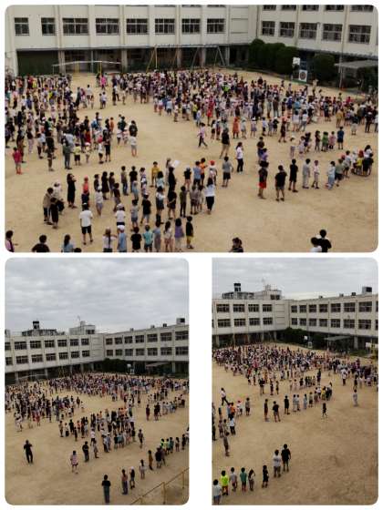 たてわり班で並び、校歌と大阪市歌を元気に歌いました。