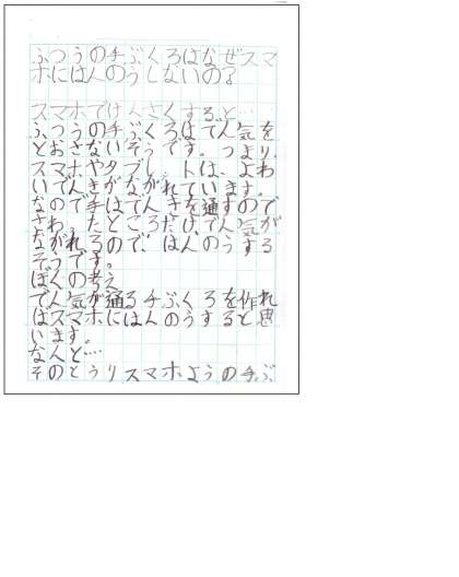 今日、玄関での登校指導中に、2年生の男の子から自主勉強ノートを預かりました。「普通の手ぶくろはなぜスマホにはんのうしないの?」という題名です。詳しくは→こちらをクリックしてください。