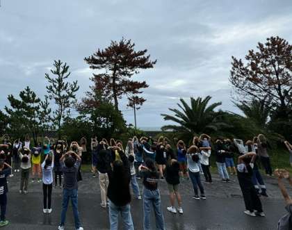 二日目の朝です。大雨が予想されていましたが、奇跡的な止み間で外に出て朝のつどいができました。