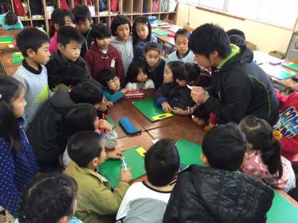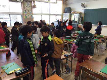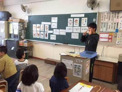 本校では、大阪市の事業である5・6年生を対象としたC−NETの他に、「校長経営戦略予算」を活用し、地域にお住いのAngela先生に来ていただき、全学年順番に、英語に親しめるようにしていることは以前からお知らせしている通りです。今回は2年生の担任による英語活動の様子をお伝えします。最初のクラスは、まず、8種類の動物の名前を英語でどう言うのかキーワードゲームやターンカードゲームをして確認した後、“What animal do you like?”“I like 〜s.”というインタビューゲームをしました。授業の振り返りカードには、「始めはむつかしいと思ったけど、やってみたら楽しかった」「楽しく英語で話したら、楽しく勉強できる」「言葉がわからなくても、アイコンタクトや笑顔でことばが通じると思った」などの感想が見られました。