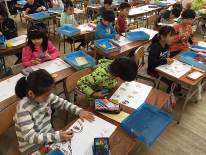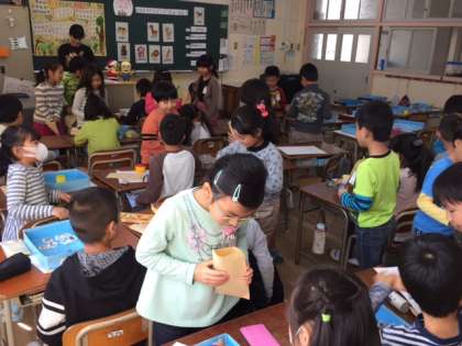 二つ目のクラスは、同じように動物の名前を英語でどう言うかを復習した後、「自分だけの動物園をつくる」ために友だちと“〜(好きな動物) please.”“Here you are.”“Thank you.”“See you.”という会話をしながら動物カードをやりとりするという活動をしました。どちらのクラスも、事前のアンケートで90%を超える児童が「英語は楽しい」と答えており、恥ずかしそうに話す子、堂々とやりとりできる子、教えてもらったフレーズを一生懸命に使おうとしている子、それぞれ個性がありますが、どの子も進んで英語活動に参加していました。授業の終わりに一人の子どもが、「校長先生、楽しかったって英語で何というの?」と尋ねに来たので、“I had a good time”と教えてあげると、担任の先生のもとに駆け寄り、“I had a good time”と笑顔で伝えていました。