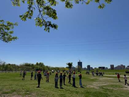 浄水場でお昼ご飯を食べた後は、淀川河川公園での自由遊びの時間です。天候にも恵まれて、春の涼しい風と少し暑くも感じる日差しの中、思いっきり遊んでいました。