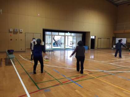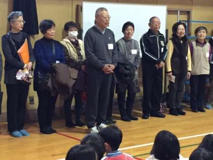 今日ははぐくみネットの方々25名にお越しいただき、1年生が伝承遊びを楽しみました。まず、児童代表の子どもたちがあいさつをし、その後、綱島連合町会長さんが子どもたちにお話してくださいました。羽根つき、こままわし、お手玉など子どもたちが回ってくる前にみなさんウォーミングアップしておらました。