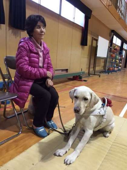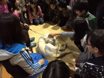 明朗活発だった子どもが、視力を失い、おとなしくて、いるのかいないのかわからない子どもになってしまった。でも、今では何でもやってみないとわからない、だからいろいろなことに挑戦していると自己紹介をされた後、補助犬には「盲導犬」「介助犬」「聴導犬」があること、「盲導犬」の仕事は視覚に障がいのある人が安全に歩けるよう誘導することだけで、着替えを手伝ったり、食事を作ってくれたりはしません。視覚に障がいがある人が外出するときは、予め、頭の中で地図を描いてから出かけます。盲導犬は、「待つ」ことと、「命令に従うこと」ができないといけませんというお話をしてくださいました。ハーネスをつけている間はお仕事中で集中しているフェリシアですが、ハーネスを外してもらった瞬間、普通の犬と同様おなかを見せて寝転んだり、「遊ぼ!」とちょっかいを出してきたりしていました。休憩が終わり、また、ハーネスをつけてもらった途端、山本さんの足元に、「ふせ」の姿勢で寄り添っていました。切り替えがすばらしいと感心しました。山本さんは「最初から無理と決めてしまわないで、まずはやってみること。がんばればできる。」ということを子どもたちに伝えたかったと話しておられました。