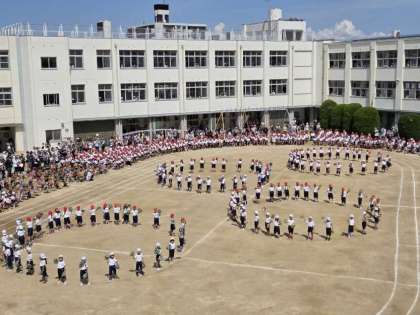 小さな体を一生懸命動かし、種目名のとおり「笑」顔いっぱい、小学校初めての運動会を楽しみました。児童席からも自然と手拍子がでていました。