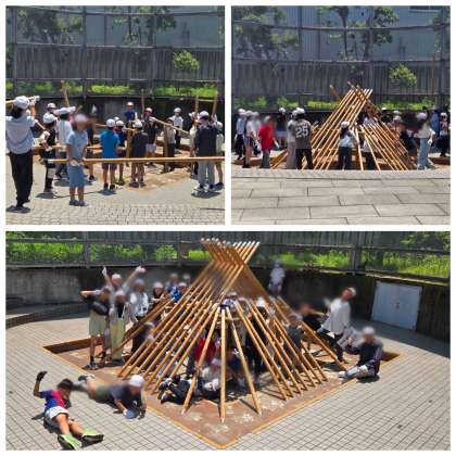 クラスごとに木材を使って竪穴住居の組み立て体験をしました。
