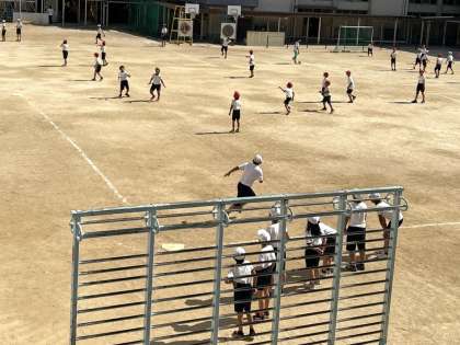 運動場では、四つのコートに分かれてキックベースボールを楽しむ子どもたちの元気な姿が見られました。