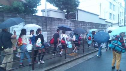 雨の中、元気な顔でみんなバスから降りてきました。