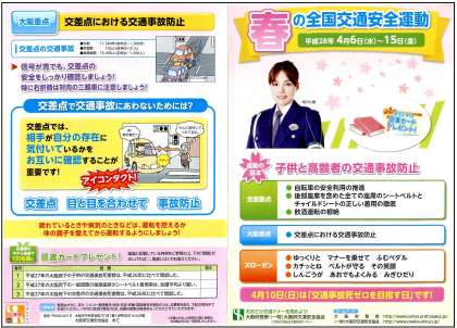 平成28年度始業式を前に、昨日、連合町会長さんをはじめ南田辺連合の方、東住吉区役所の方、東住吉警察の方、学校の教職員で校区を巡回し、通学路の安全点検を行いました。道路や道路標識、交通安全施設等の点検等を行い改善策などの意見交換を行いました。大阪府下では、交差点・自転車・高齢者の交通事故が多いようです。明日6日(水)から15日(金)までは春の交通安全運動です。パンフレットをいただきましたので参考になさってください。詳しくは→こちらをご覧ください。