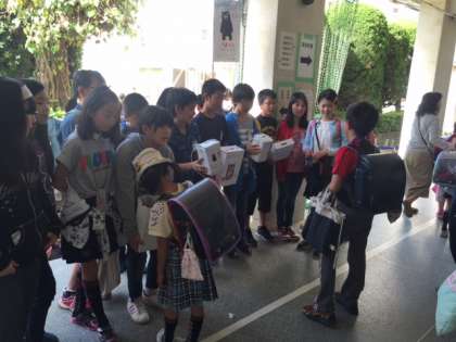 25日の全校朝会の時に6年生の代表の子どもたちが、全校児童に募金をよびかけました。翌26日(火)〜28日(木)までの3日間、6年生の子どもたちが玄関に立ち、募金活動を行いました。この募金のことをどこからか聞かれた地域の方もわざわざ早朝に学校にお越しいただき、6年生手作りの募金箱に募金してくださいました。ご協力ありがとうございました。